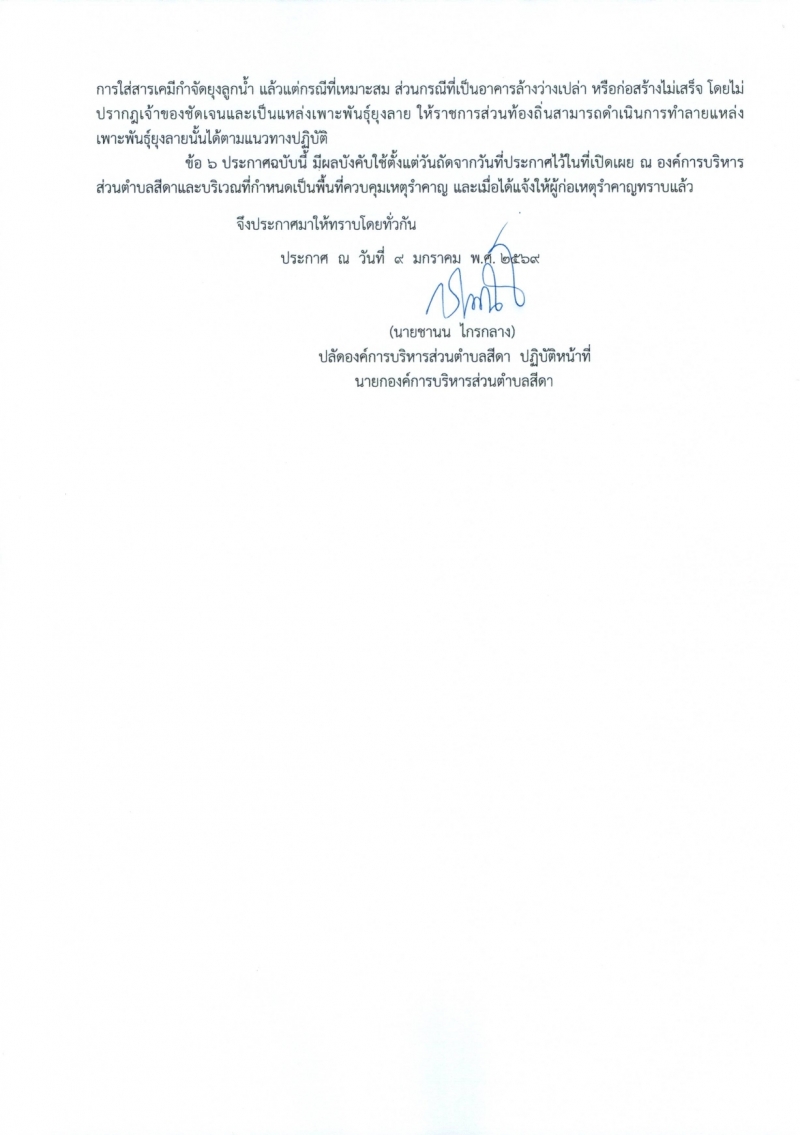 ประกาศองค์การบริหารส่วนตำบลสีดา เรื่อง กำหนดพื้นที่ควบคุมเหตุรำคาญ พ.ศ.2569
