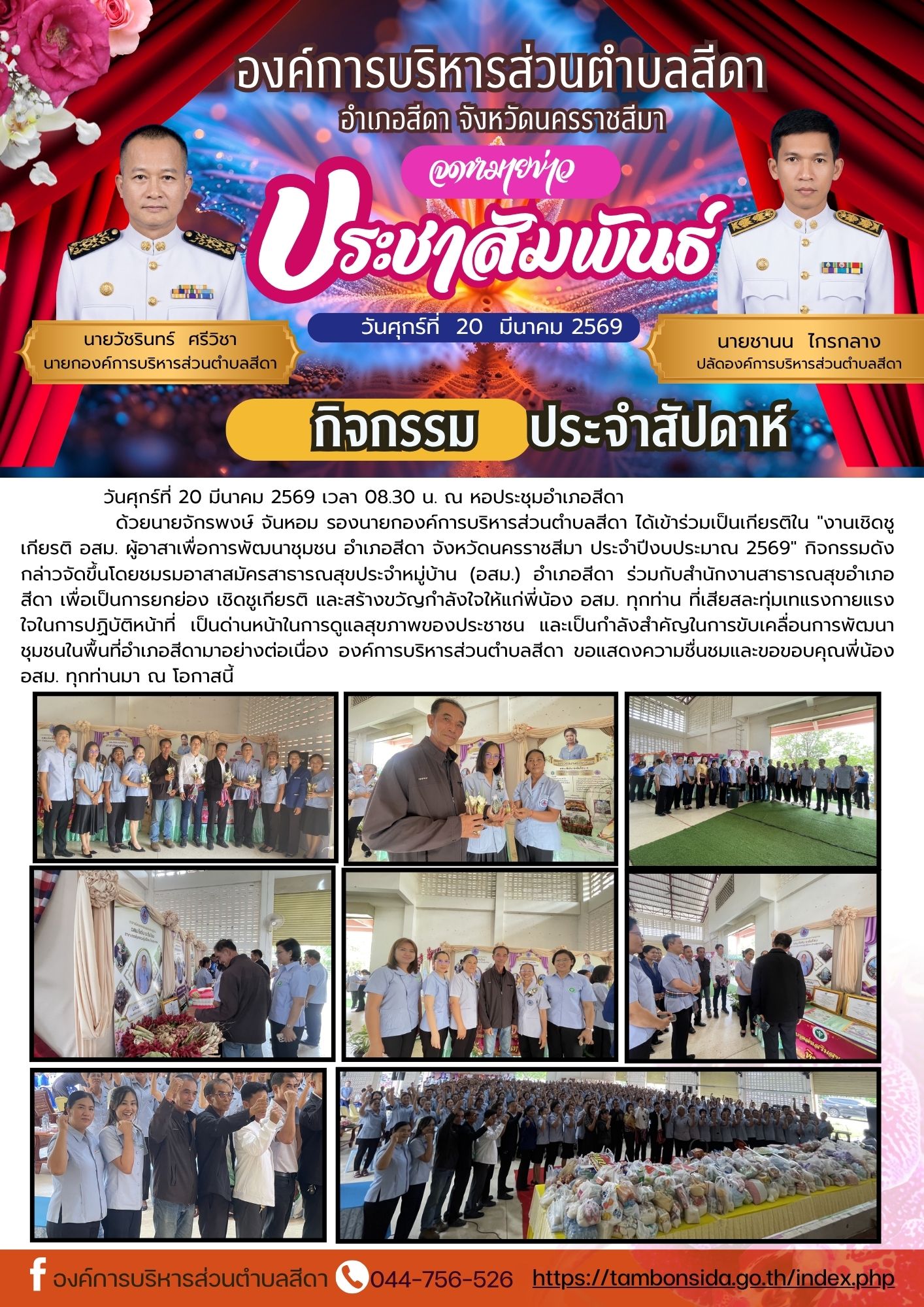 นายจักรพงษ์ จันหอม รองนายกองค์การบริหารส่วนตำบลสีดา ได้เข้าร่วมเป็นเกียรติใน "งานเชิดชูเกียรติ อสม. ผู้อาสาเพื่อการพัฒนาชุมชน อำเภอสีดา จังหวัดนครราชสีมา ประจำปีงบประมาณ 2569"